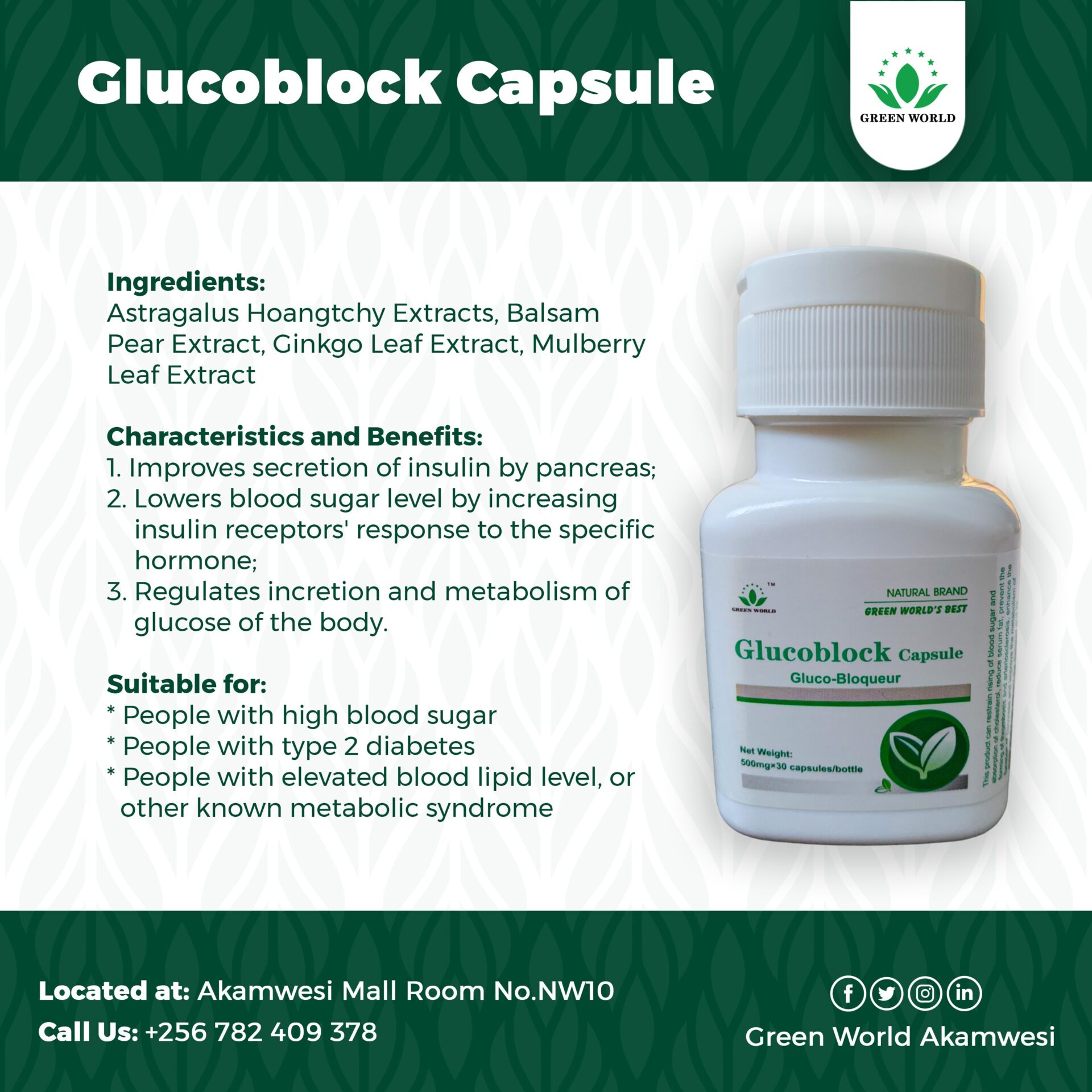 Green World Glucoblock Capsule helps the recovery of insulin secretion and improves insulin bioavailability, thus balancing the blood sugar level.