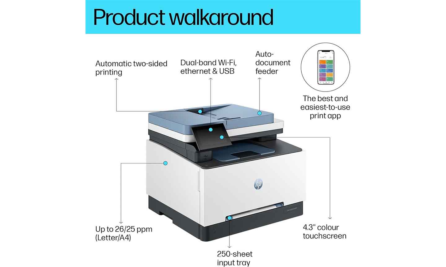 The HP Color LaserJet MFP M3303fdw is a powerful all-in-one color laser printer built to handle demanding office tasks with speed, precision, and versatility. With fast print speeds of up to 25 pages per minute in both black and color, this printer delivers vibrant, professional-quality documents in every job.