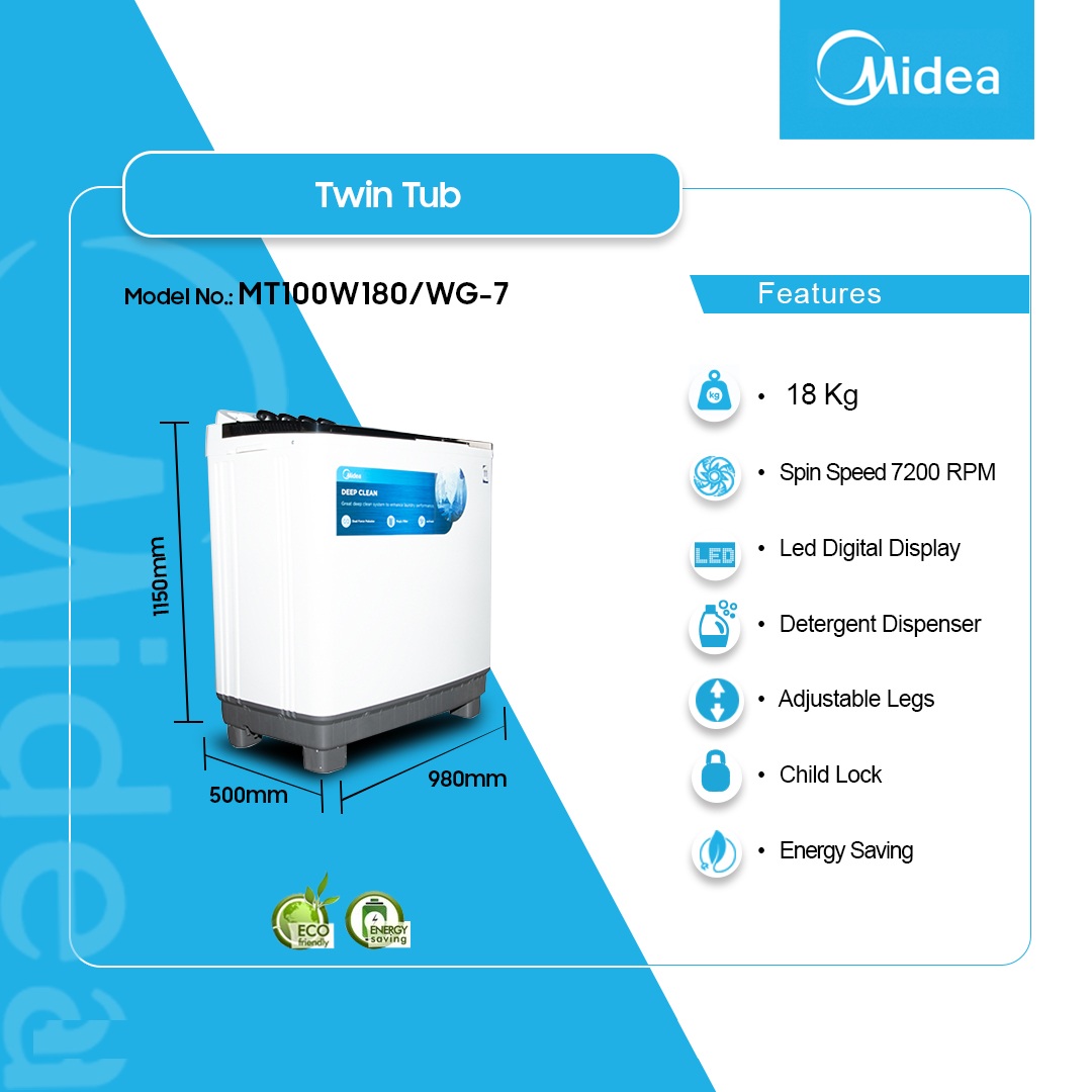 Midea 18kg Twin Tub Washing Machine Mt100w180/Wg 7 is now available in our store. Check out the details below!