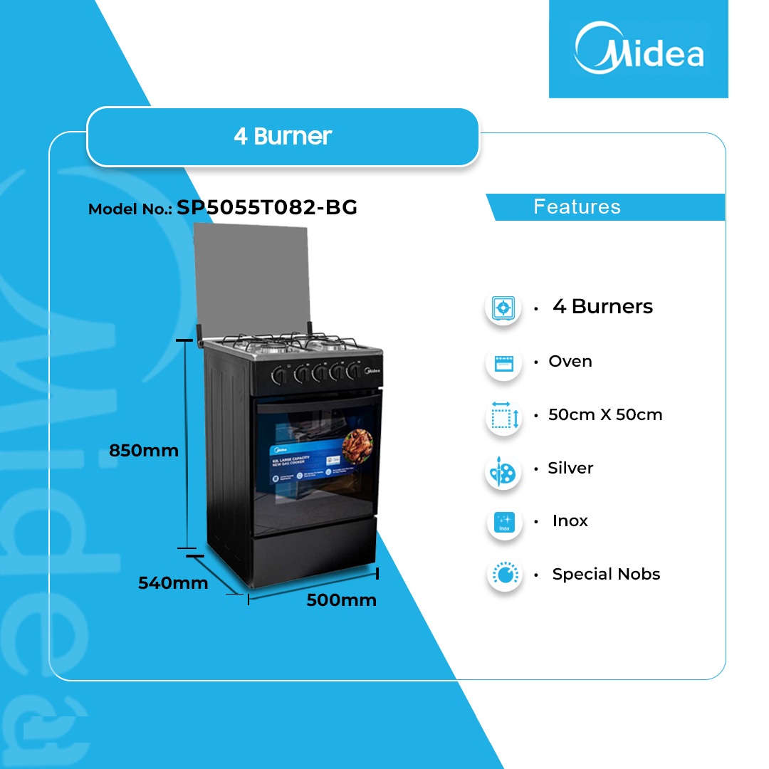 Midea 4 Burner Gas Cooker Sp5055t082 Bg is now available in our store. Check out the details below!