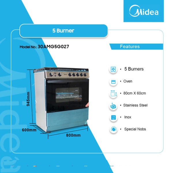 Midea 5 Burner Gas Cooker With Oven 30amg5g027 Silver in Ghana is now available in our store. Check out the details below!