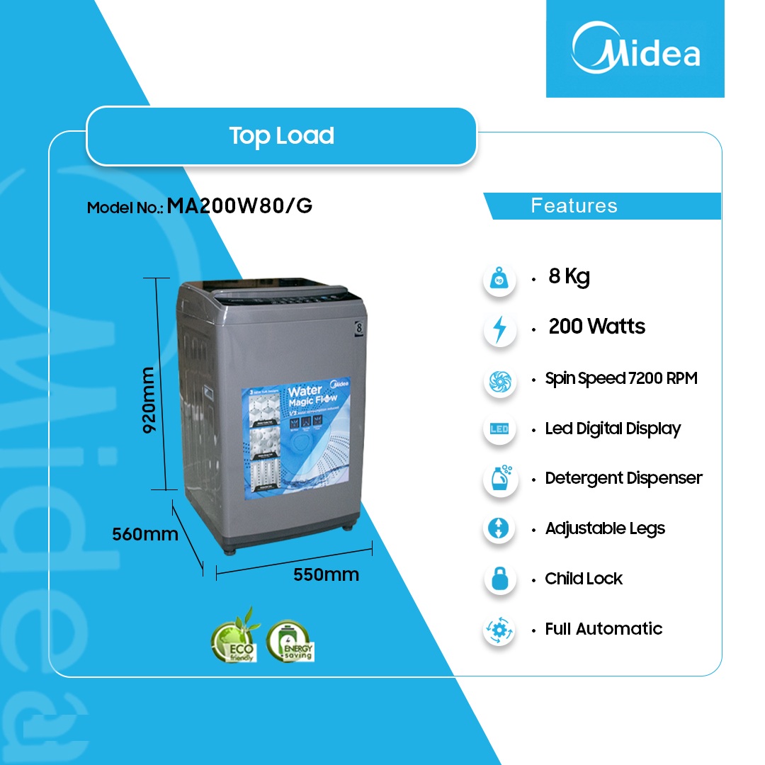 Midea 8kg Top Load Full Auto Washing Machine Ma200w80/G is now available in our store. Check out the details below!