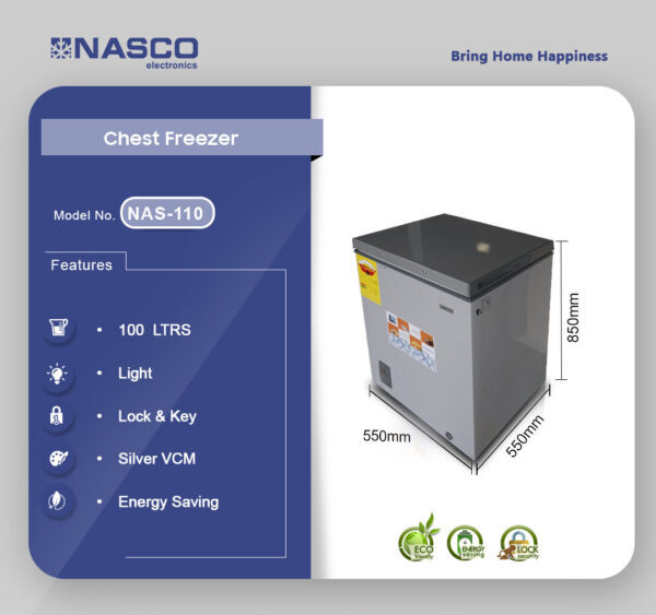 The Nasco 100Ltrs Chest Freezer Refrigerator delivers reliable freezing in a sleek, compact design perfect for homes or small businesses. Its generous 100-litre capacity allows you to store meats, vegetables, beverages, and frozen treats with ease. Whether you’re stocking up on groceries or preserving seasonal produce, this freezer offers the space you need without overwhelming your floor area.