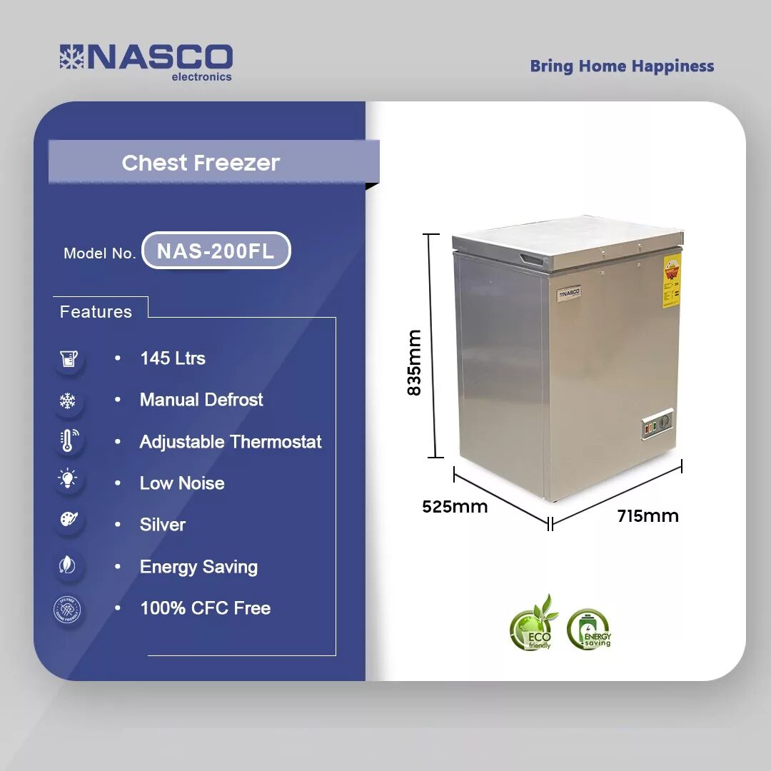 Nasco 145 Ltrs Chest Freezer 145 Ltrs • Manual Defrost • Adjustable Thermostat • Low Noise • Silver • Energy Saving • 100% CFC Free Nasco 145 Ltrs Chest Freezer Nas 200fl is now available in our store. Check out the details below! Buy now on Ololo Express