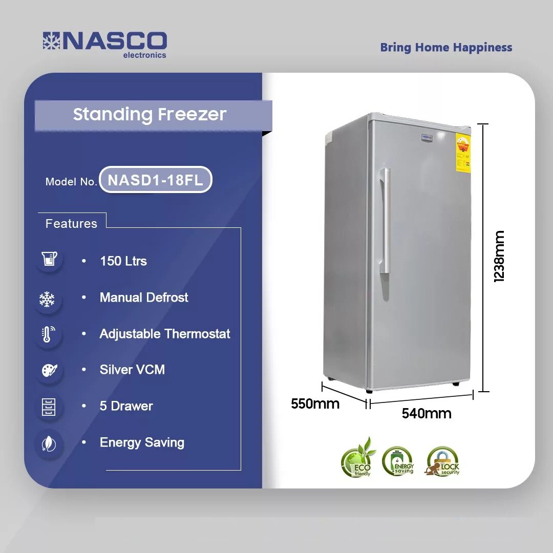 Nasco 150 Ltrs Standing Freezer 150 Ltrs • Manual Defrost • Adjustable Thermostat • Low Noise • Silver • Energy Saving • 100% CFC Free Nasco 150 Ltrs Standing Freezer Nasd1 18fl is now available in our store. Check out the details below! Buy now on Ololo Express