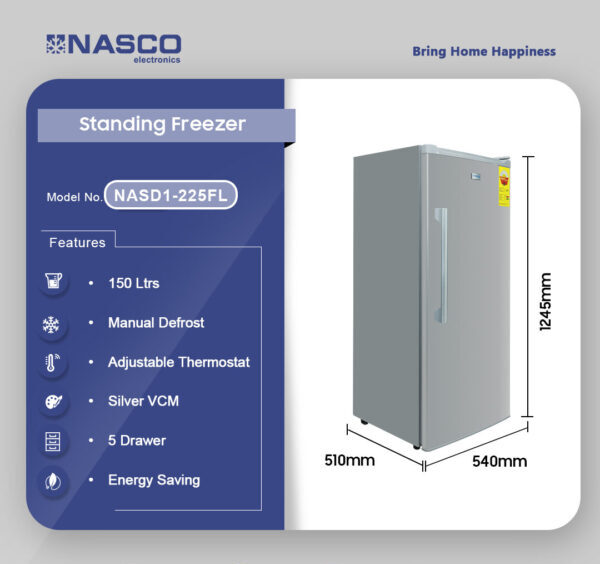 Keep your food fresh and your storage stress-free with the Nasco 150 Litres Standing Freezer NASD1-225FL. Designed for both modern homes and small commercial spaces, this upright freezer is compact outside yet spacious inside, giving you 5 large drawers to neatly organize meats, vegetables, snacks, and more.