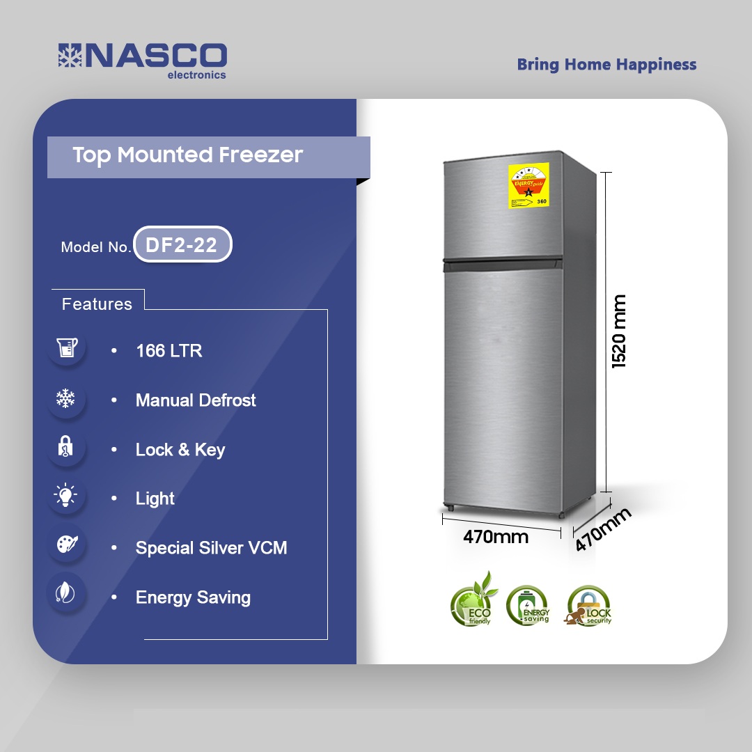 Nasco 166ltr Top Mount Refrigerator Df2 22 in Ghana Nasco 166L Top Mount Refrigerator – Efficient Cooling for Your Home Spacious & Energy-Efficient Cooling The Nasco 166L Top Mount Refrigerator DF2 22 is designed for homes, offices, and businesses in Ghana, offering ample storage capacity while ensuring energy efficiency. With its 166-liter capacity, this refrigerator keeps your food fresh for longer, providing the perfect balance between size and performance. Whether you need to store fresh produce, beverages, or frozen foods, this top-mount freezer fridge is a reliable choice. Sleek & Durable Stainless Steel Design Crafted with Silver VCM stainless steel, … Nasco 166ltr Top Mount Refrigerator Df2 22 is now available in our store. Check out the details below! Buy now on Ololo Express