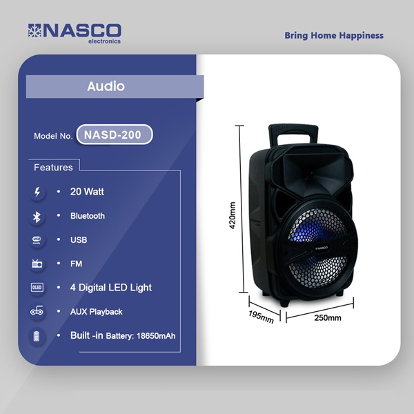 Nasco 20watt Audio Karaoke Nasd 200 in Ghana Nasco 20W Audio Karaoke Speaker – Elevate Your Music Experience Sing, play, and party with the Nasco 20W Audio Karaoke Speaker NASD 200. Designed for music lovers and performers, this compact yet powerful speaker delivers clear, high-quality sound, wireless streaming, and vibrant digital lighting to set the perfect mood. Whether you’re hosting a karaoke night, enjoying a solo jam session, or adding energy to any gathering, this versatile audio system ensures an immersive and fun-filled experience. Selling in Ghana on Ololo Express online marketplace. Crisp 20W Sound for the Ultimate Audio Experience … Nasco 20watt Audio Karaoke Nasd 200 in Ghana is now available in our store. Check out the details below! Buy now on Ololo Express