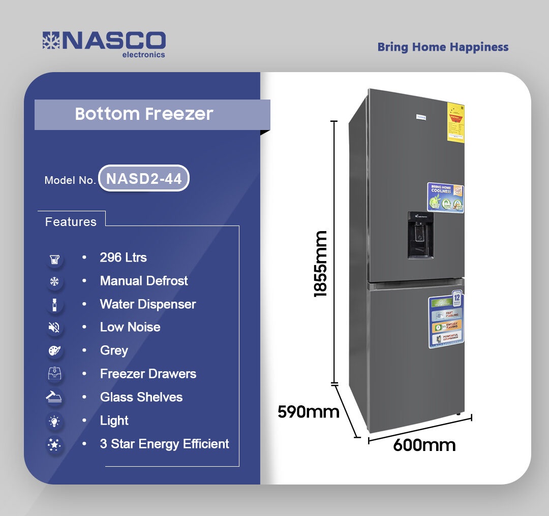 The Nasco 287Ltrs Bottom Freezer Refrigerator NASD2-44 is designed for modern homes in Ghana.