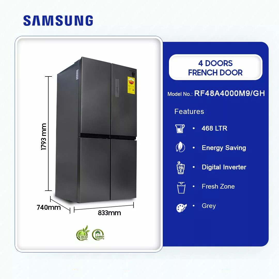 Samsung 468ltr Refrigerator 4 Doors French door Rf48a4000m9/Gh in Ghana Samsung 468L 4-Door French Door Refrigerator – Efficient & Stylish Cooling in Ghana Premium Cooling for Your Home Upgrade your kitchen with the Samsung 468L 4-Door French Door Refrigerator (RF48A4000M9/GH). Designed for modern households in Ghana, it offers spacious storage and advanced cooling technology. Whether you live in Accra, Kumasi, Tema, Takoradi, or Cape Coast, this energy-efficient refrigerator ensures fresh and organized food storage. Featuring Twin Cooling Plus™, it maintains optimal humidity levels to keep food fresh for longer. The Fresh Zone preserves fruits, vegetables, and meats at the perfect temperature. … Samsung 468ltr Refrigerators 4 Doors Frenchdoor Rf48a4000m9/Gh is now available in our store. Check out the details below! Buy now on Ololo Express