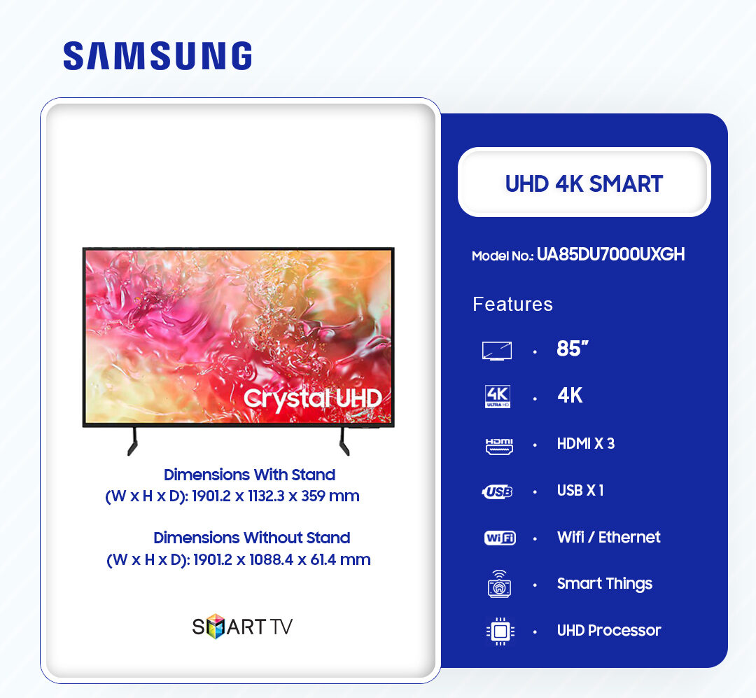 Samsung 85″ Uhd 4k Smart Tv Ua85du7000uxgh is now available in our store. Check out the details below!