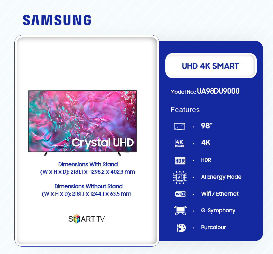 Samsung 98″ Crystal Uhd 4k Smart Tv Ua98du9000 is now available in our store. Check out the details below!