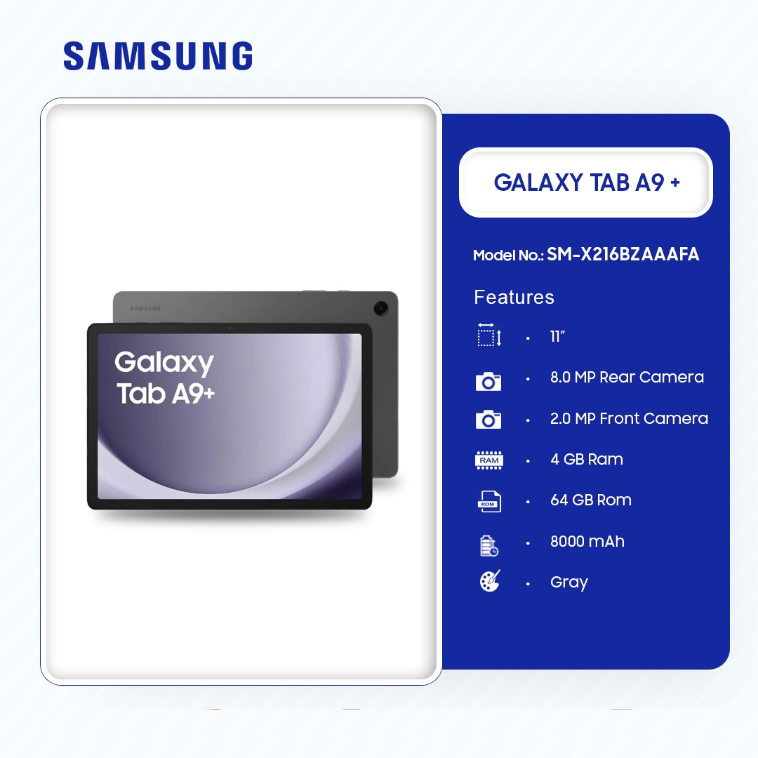 Samsung Galaxy Tab A9+ in Ghana Samsung Galaxy Tab A9+ – Elevate Your Digital Experience Step into a world of seamless performance with the Samsung Galaxy Tab A9+. Featuring a vivid 11-inch display, powerful 4GB RAM, and 64GB storage, this tablet is built to keep up with your multitasking needs. Whether you’re streaming, gaming, or working, the Galaxy Tab A9+ delivers ultra-smooth performance in a sleek gray design that complements any lifestyle.Selling in Ghana on Ololo Express online marketplace. Immersive Display & Long-Lasting Power Experience stunning clarity on the 11.0-inch display, perfect for entertainment, reading, and work. The 8000mAh battery … Samsung Galaxy Tab A9+ in Ghana Sm X216bzaaafa is now available in our store. Check out the details below! Buy now on Ololo Express