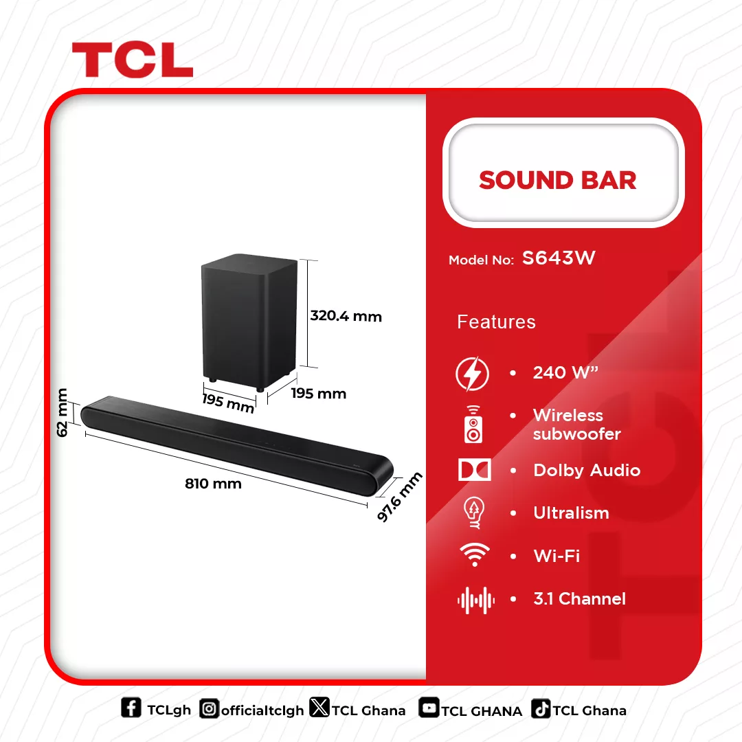 Tcl Audio Sound Bar 240w S643w in Ghana TCL 3.1 Channel 240W Soundbar – Immersive Home Theater Experience Upgrade your entertainment with the TCL Audio 3.1 Channel Sound bar 240w S643W. With 240W of powerful sound, Dolby Audio, and DTS® Virtual:X™, this sound system brings a cinematic audio experience to your home. The wireless subwoofer delivers deep bass, while Wi-Fi and Bluetooth connectivity provide seamless music streaming.Selling in Ghana on Ololo Express online marketplace. Powerful 3.1 Channel Sound with Wireless Subwoofer Feel the thrill of real-time simultaneous sound with the TCL 3.1 channel audio system. The wireless subwoofer enhances low … . Check out the details below! Buy now on Ololo Express