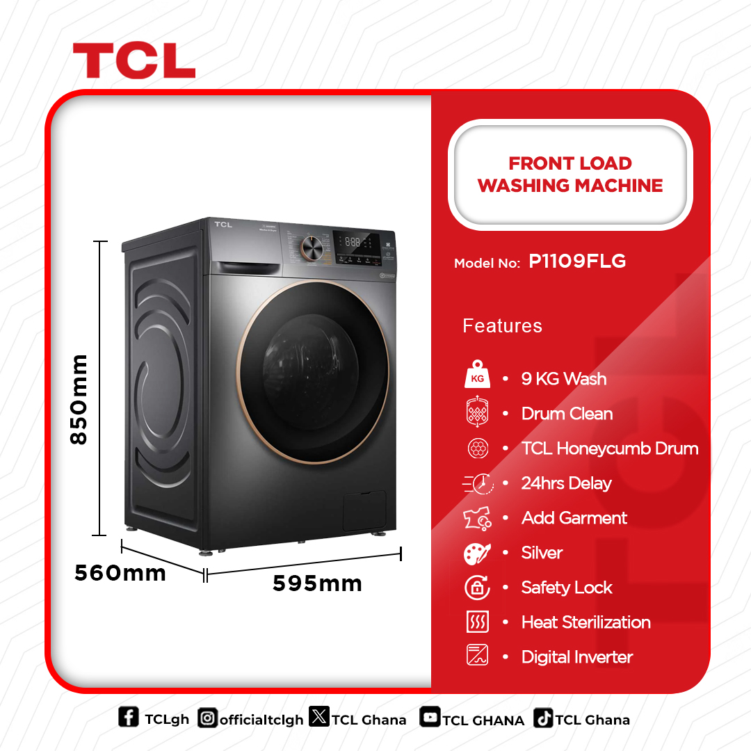 TCL Front Load Inverter 9KG Washing Machine P1109FLG in Ghana – Buy Now, Pay Later Hygienic Cleaning with Heat Sterilization Upgrade your laundry routine with the TCL Front Load Inverter 9KG Washing Machine P1109FLG, designed for deep cleaning, energy efficiency, and superior fabric care. Featuring advanced heat sterilization, this washing machine eliminates 99.9% of bacteria, ensuring your clothes are not only clean but also safe for your family. The Honeycomb Drum technology treats fabrics gently yet effectively, preserving their quality while delivering a powerful wash. 💰 Buy now and pay later with flexible hire purchase plans in Ghana! Key Hygiene … Tcl Front Load Inverter 9kg Washing Machine is now available in our store. Check out the details below! Buy now on Ololo Express