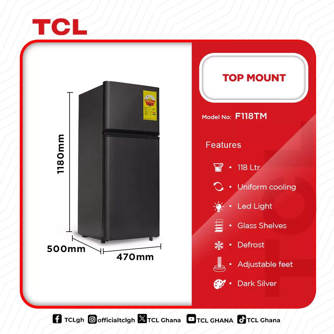 TCL 118L Top Mount Fridge in Ghana – Buy Now, Pay Later Looking for a compact yet spacious refrigerator for your home, office, or shop? The TCL 118L Top Mount Fridge offers uniform cooling, durable glass shelves, LED lighting, and a sleek dark silver finish to complement any modern space. Whether you need a reliable fridge for everyday use or extra storage for fresh food and beverages, this refrigerator is the perfect choice for Ghanaian households and businesses. Now available on Ololo Express online marketplace, you can buy this TCL fridge on hire purchase with flexible payment options. Get yours … Tcl Top Mount Fridge 118ltrs F118tm is now available in our store. Check out the details below! Buy now on Ololo Express