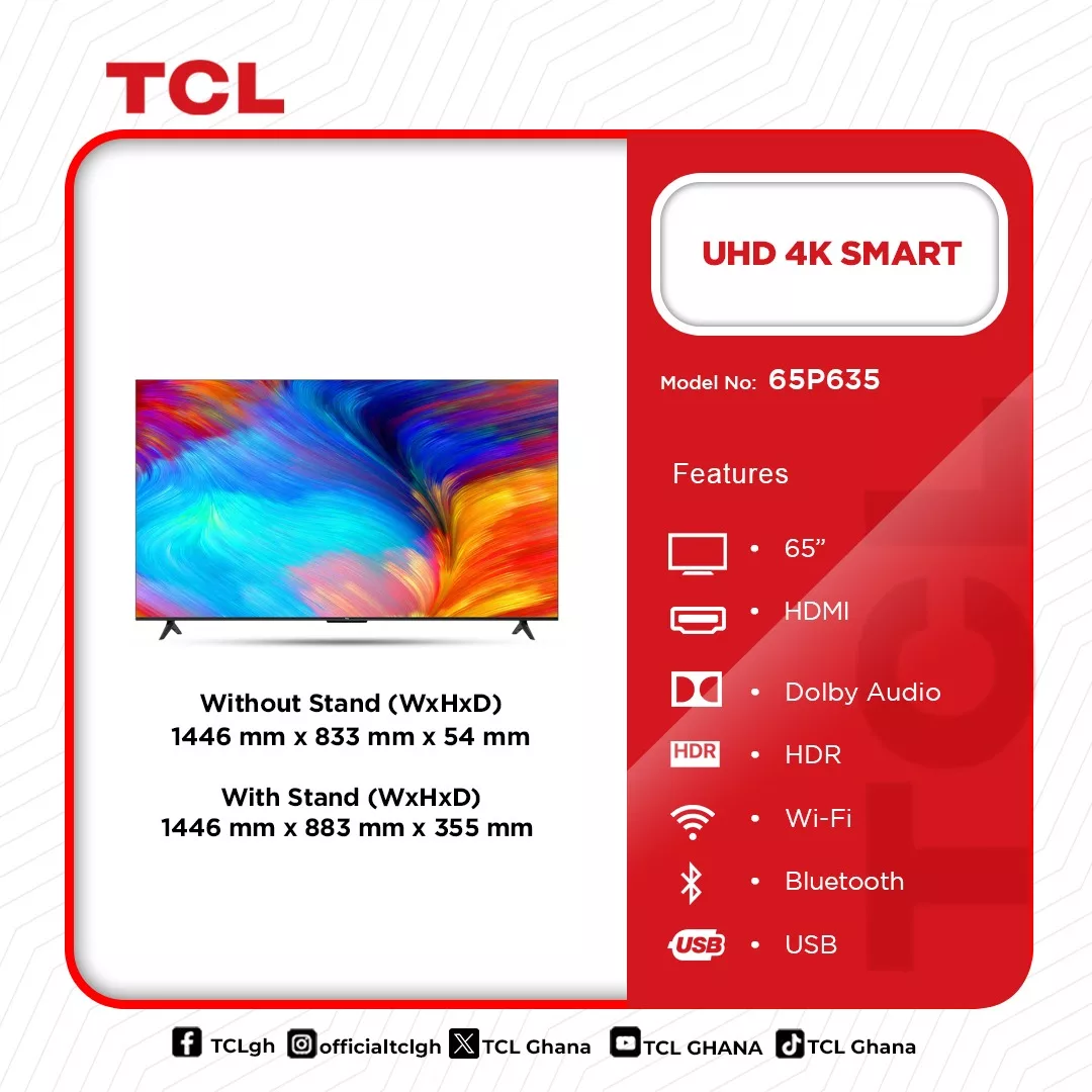 Tcl Uhd 4k Smart Android 65 Inches 65p635 in Ghana Unmatched 4K Clarity with a Frameless Design Transform your home entertainment with the TCL 65-Inch UHD 4K Smart Android TV (65P635). Featuring an ultra-slim frameless metal frame, this premium television blends seamlessly into your space, delivering a modern, sophisticated look. With 3840 x 2160 pixels resolution, enjoy four times the detail of Full HD for an immersive viewing experience. The 5000:1 dynamic contrast ratio enhances depth, ensuring richer blacks and vibrant colors. Whether you’re watching movies, gaming, or streaming, this TCL Smart TV delivers breathtaking clarity and exceptional detail. Google … Tcl Uhd 4k Smart Android 65 Inches 65p635 is now available in our store. Check out the details below! Buy now on Ololo Express